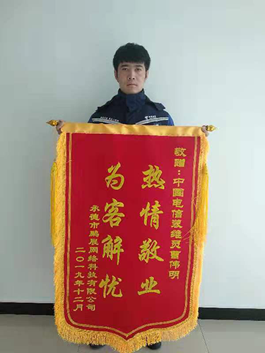 近日,承德一用户拨打本地报修宽带故障,告知公司员工正在加班,需要着急使用网络,要求维修人员立即上门处理。承德公司装维工程师曹伟明于第一时间联系用户,并于15分钟内到达约定地点进行维修。因用户是办理了多条家庭宽带的小型企业,对宽带网络故障表现的十分焦急,装维工程师曹伟明一边耐心地安抚用户的情绪,耐心地为用户解答,一边快速查找故障点进行维修,经过5分钟的寻找发现,用户施工将棚内的皮箱破坏,装维工程师在确保自身安全的前提下,进入棚内从新布放皮线,经过30分钟辛苦的施工,于晚上9点为用户解决问题,并告知用户使用注意事项及个人联系方式。曹伟明优质的服务赢得用户的认可。用户20分钟后再一次拨打本地保修电话,对前去维修的曹伟明提出表扬;并为自己态度不好的行为表示歉意,并于第二天到市公司赠送锦旗。